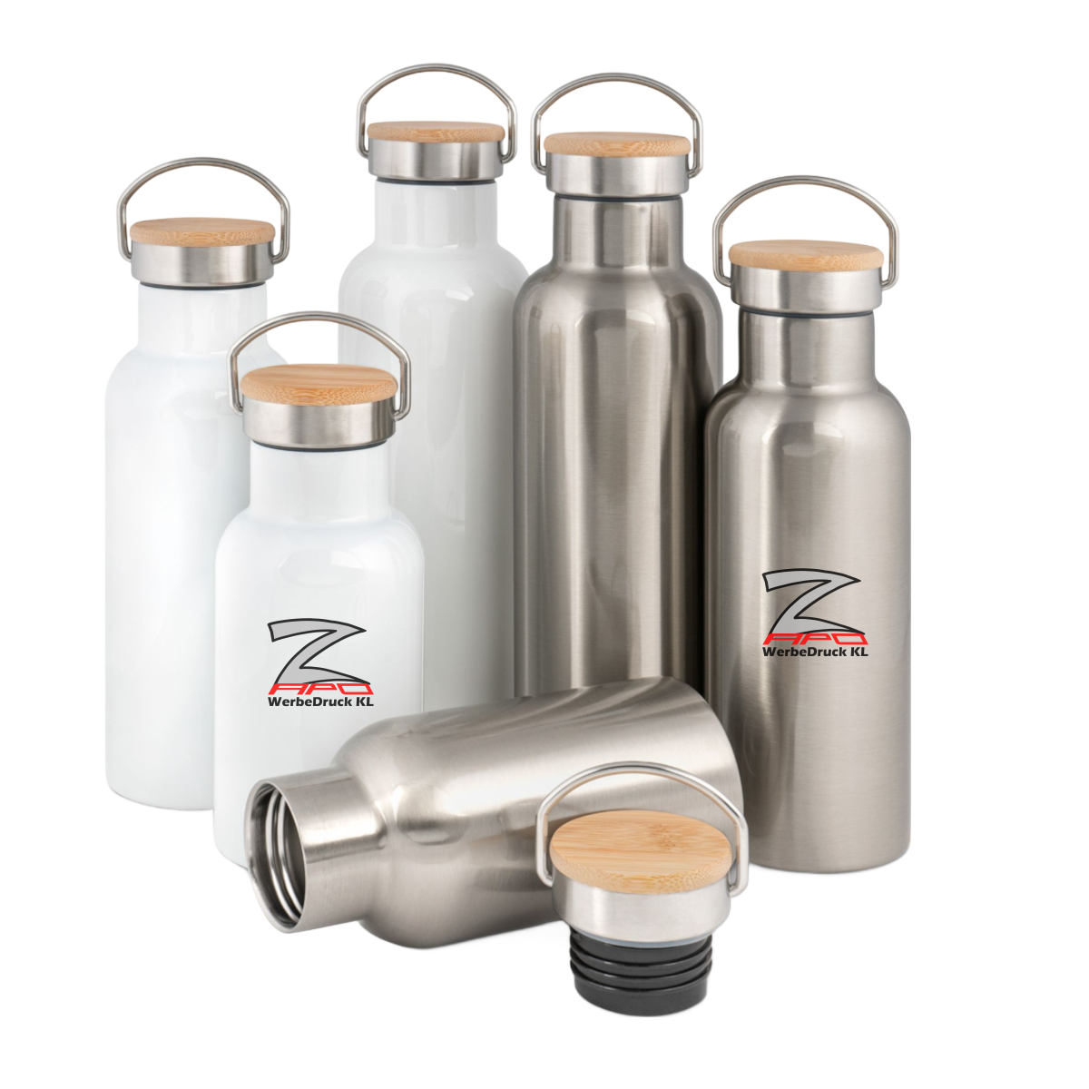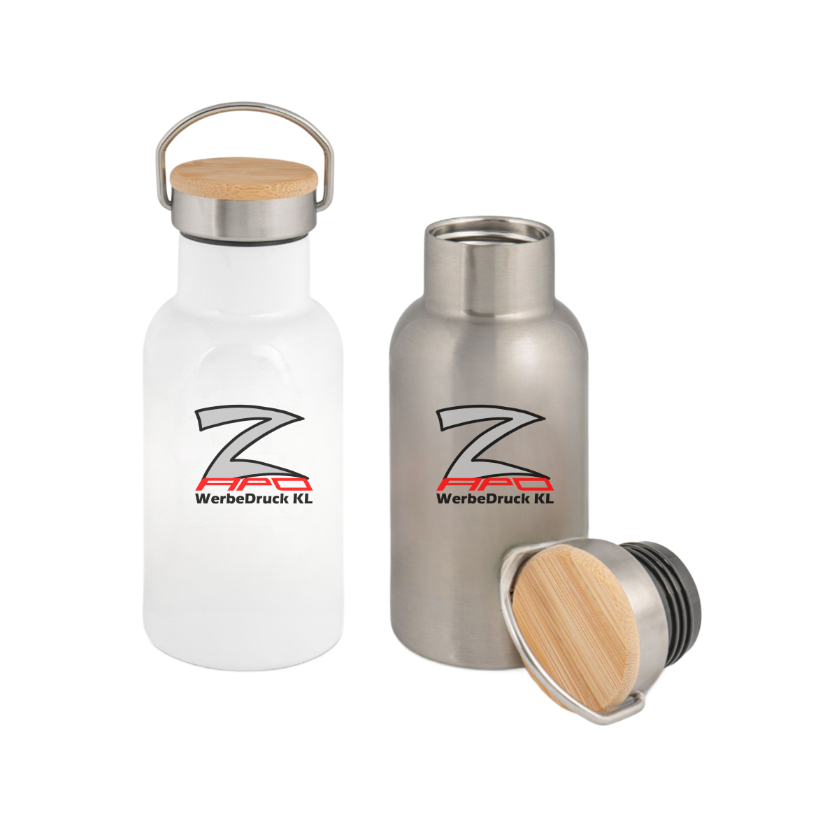 Stainless steel thermos flask with bamboo lid in various sizes and colors