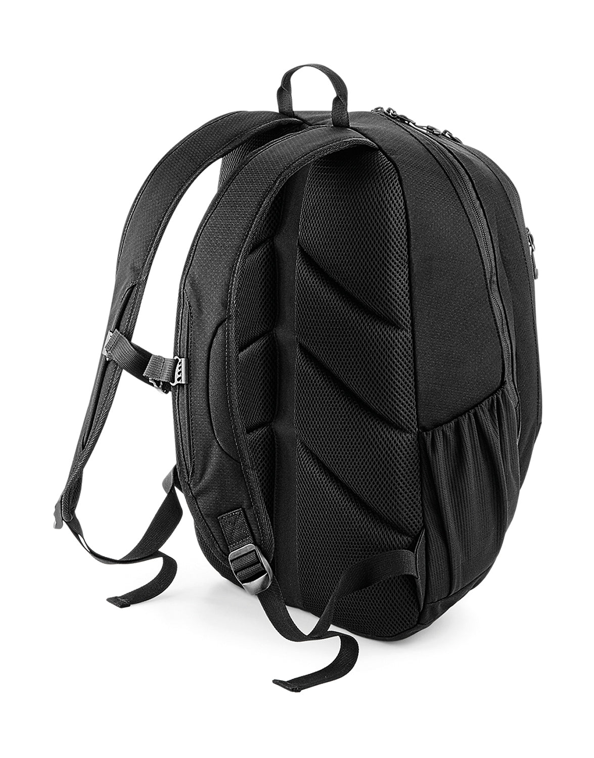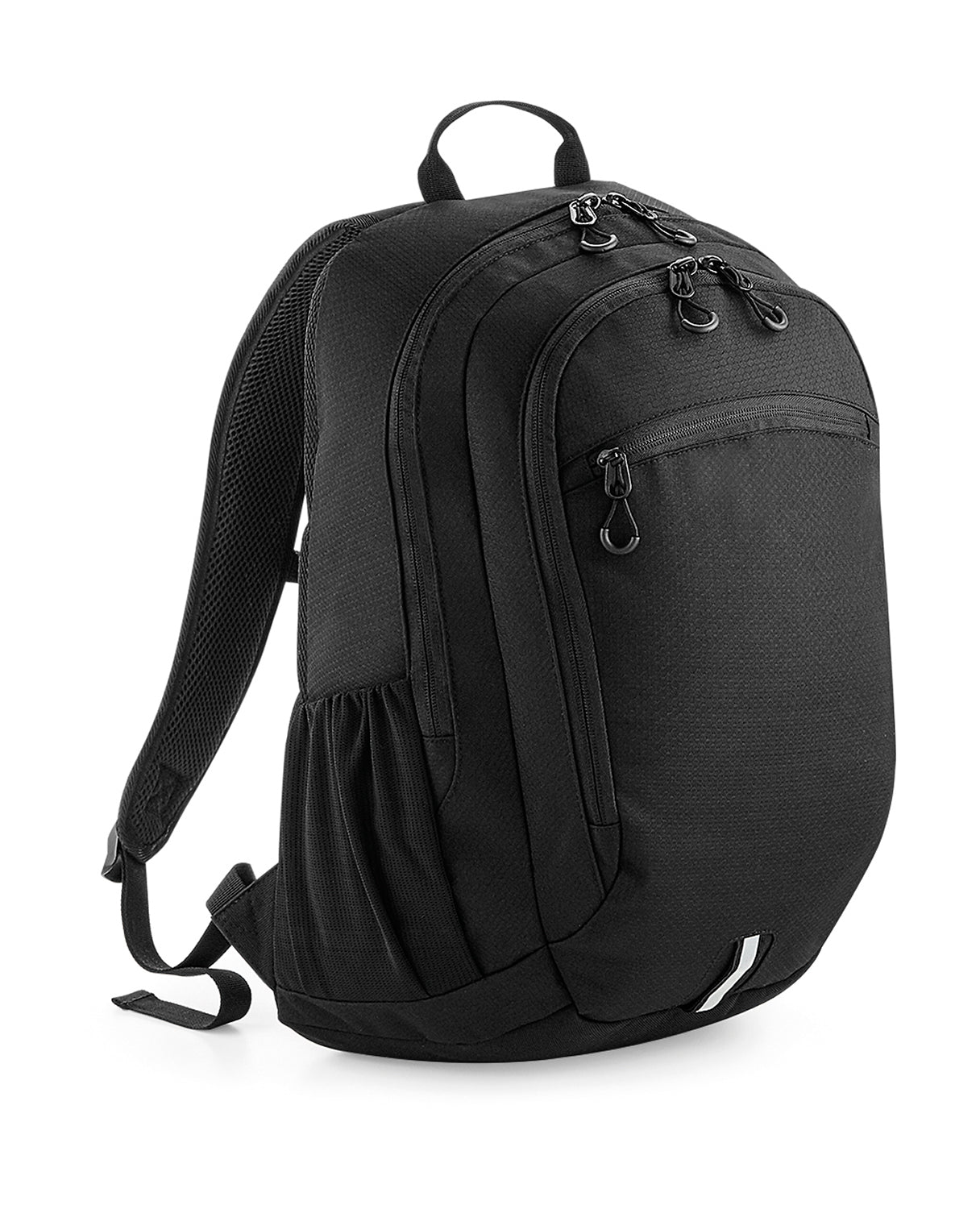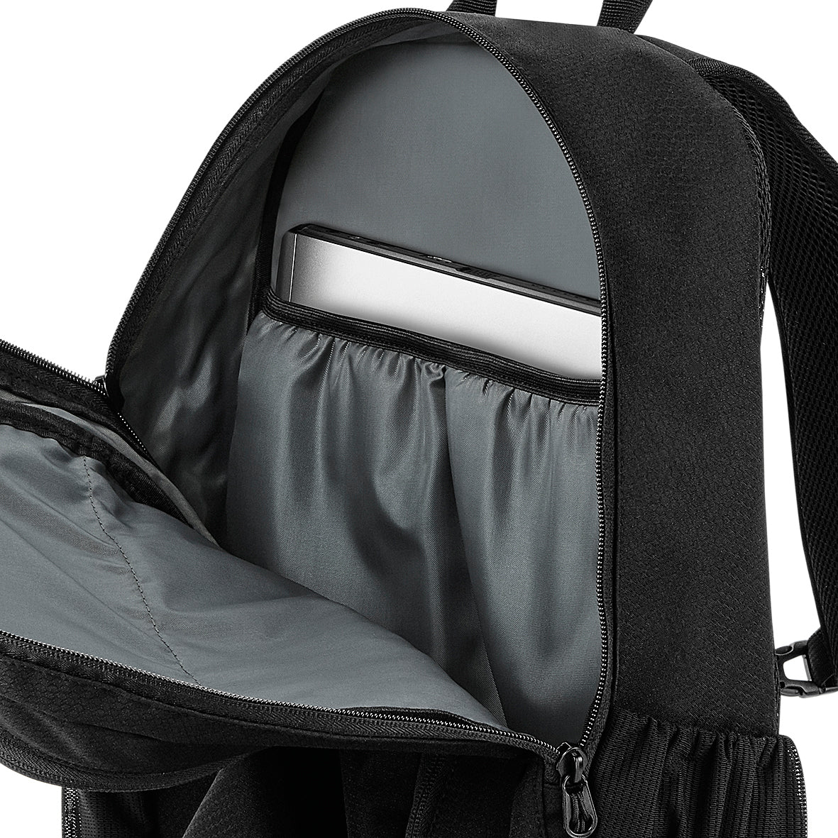 The padded laptop compartment securely protects devices up to 15.6 inches. Practical front and mesh interior pockets, as well as two mesh side pockets and a water bottle holder, ensure clear organization.