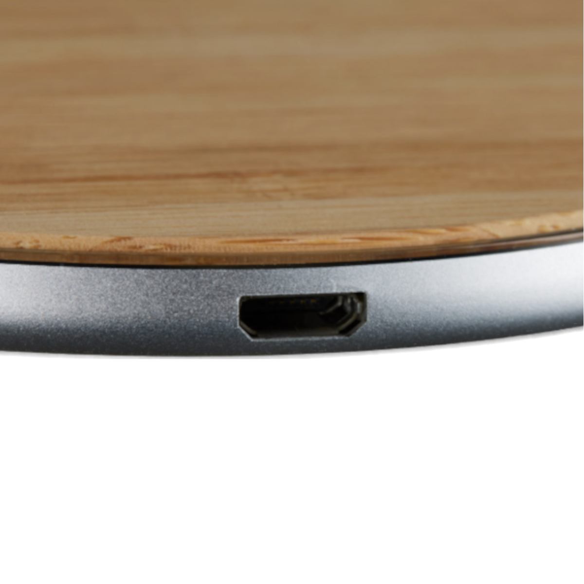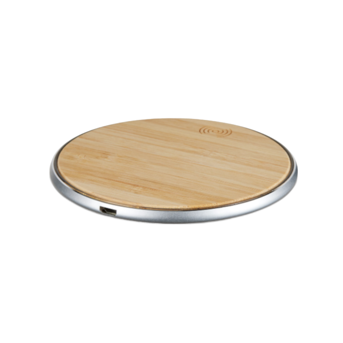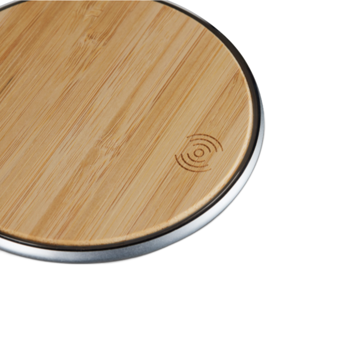 Wireless charger with aluminum casing and natural bamboo finish, including cable. Lights up while charging. Printable via laser or UV direct printing.